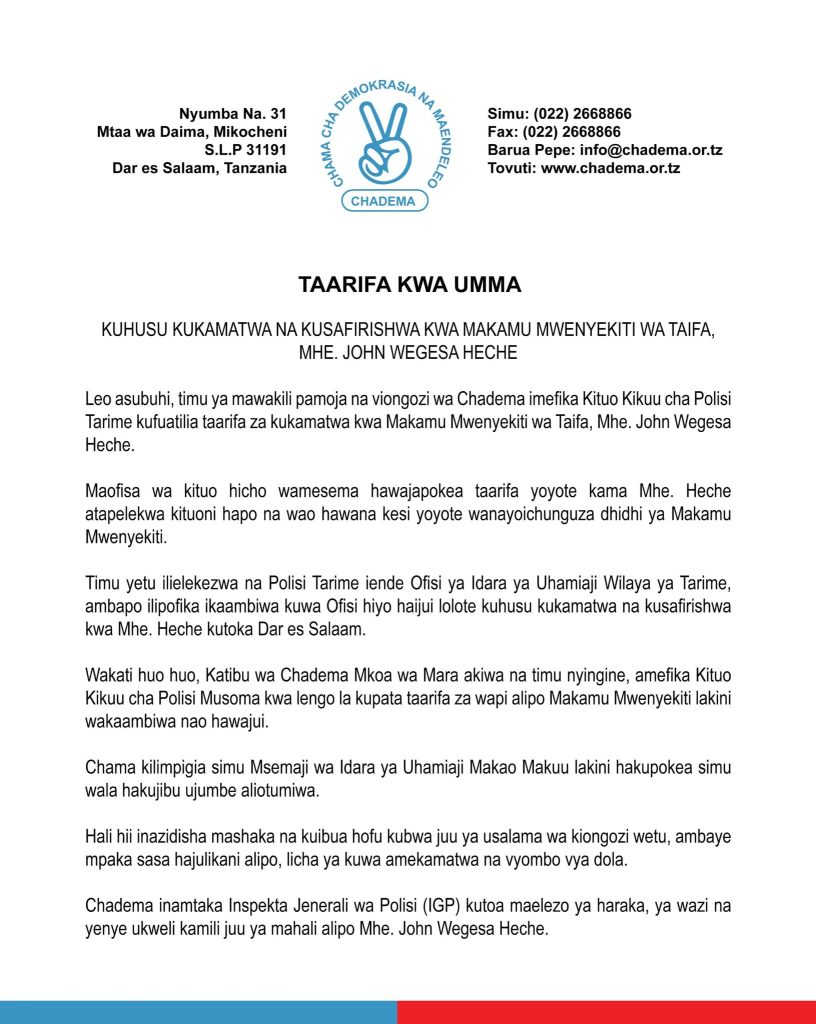 In a statement released on Thursday, October 23, the party said its legal team and regional leaders visited several police and immigration offices in Tarime and Musoma but were told there were no records of Heche’s detention or transfer. The party said this deepens fears about his safety and the growing pattern of intimidation against opposition figures ahead of the October 29 general election.
