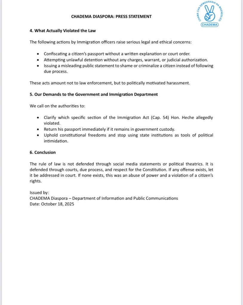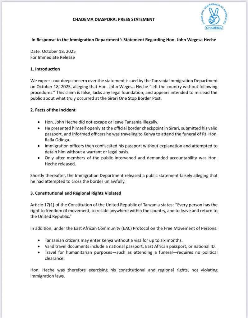In a detailed statement released on October 18, 2025, CHADEMA dismissed a claim by Tanzania’s Immigration Department that Heche “left the country without following procedures,” describing it as false, misleading and politically driven.
