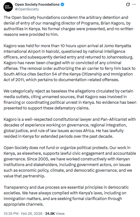 Open Society has emphasized that it does not fund or organize political protests and that its work supports lawful civic engagement. It said it is seeking formal clarification from Kenyan authorities regarding Kagoro’s removal.