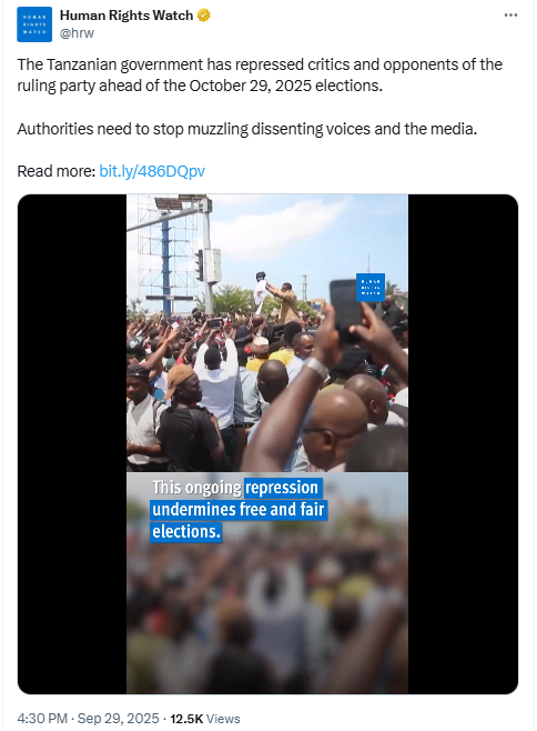 The warning follows a recent Human Rights Watch report accusing the government of silencing opposition parties, restricting media and arresting activists in the race to the polls. CHADEMA Chair Tundu Lissu is currently facing treason charges, a case that rights groups and the European Parliament have described as politically motivated to block him from challenging President Samia Suluhu Hassan.