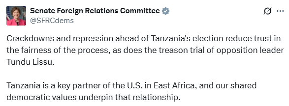 In a statement posted on X, the committee said, “Crackdowns and repression ahead of Tanzania’s election reduce trust in the fairness of the process, as does the treason trial of opposition leader Tundu Lissu. Tanzania is a key partner of the U.S. in East Africa, and our shared democratic values underpin that relationship.”